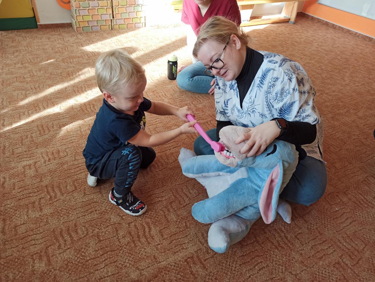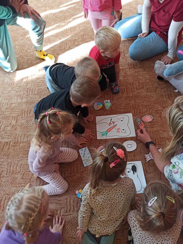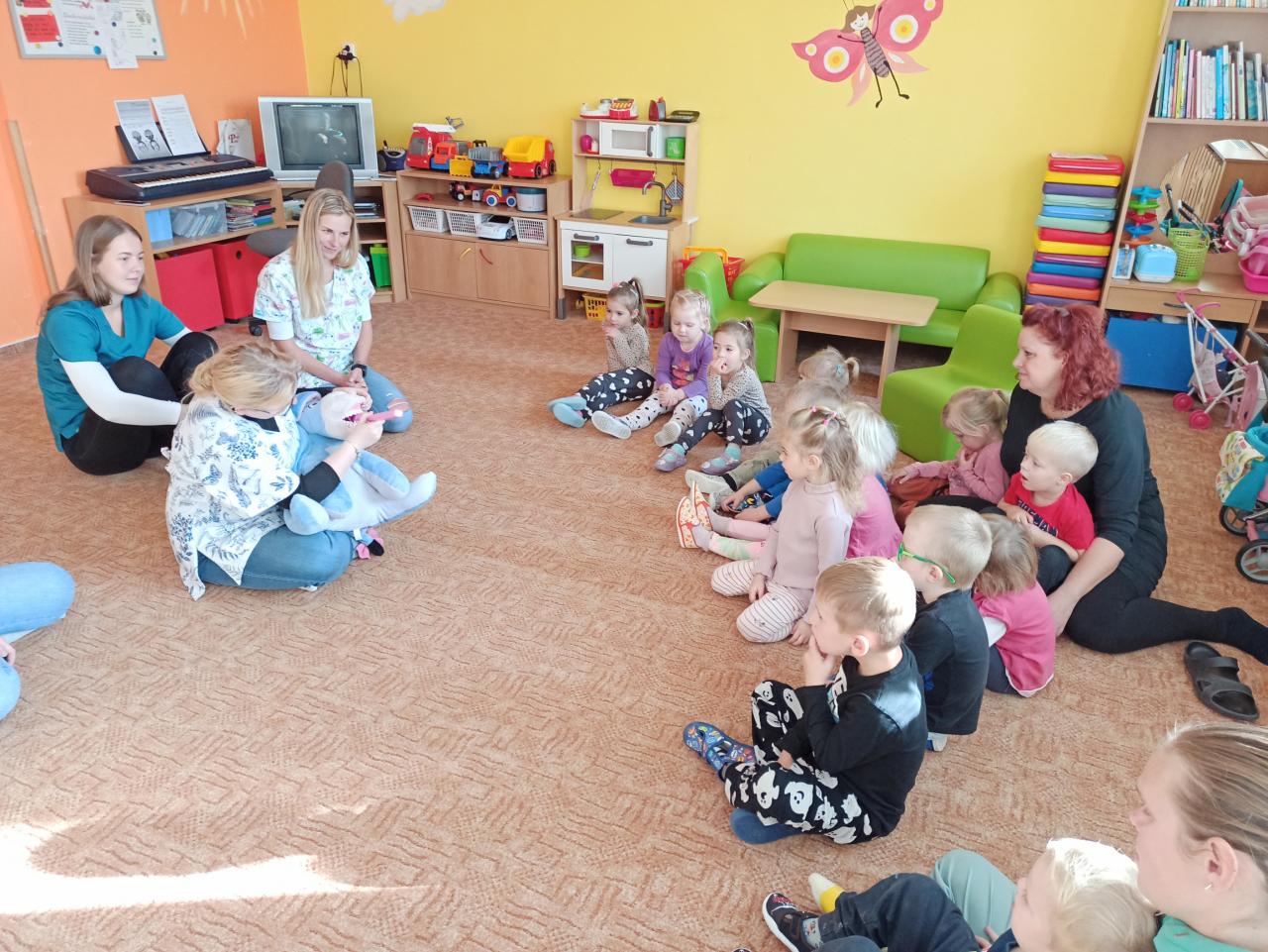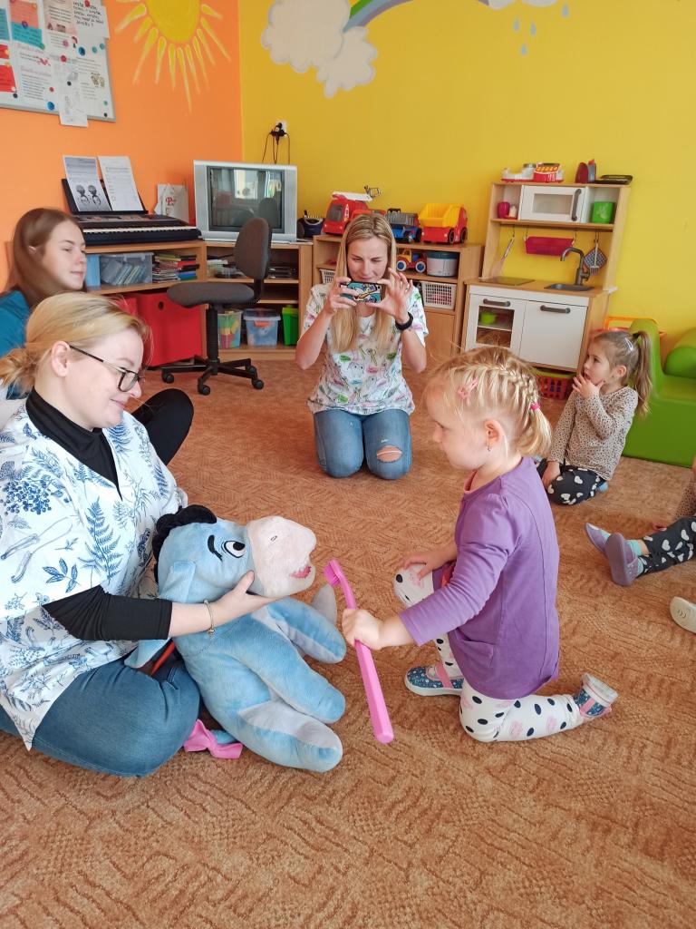Ve čtvrtek 9. 11. přijely do školky studentky Slezské univerzity, které dětem hravou formou předvedly, jak se starat o zoubky.